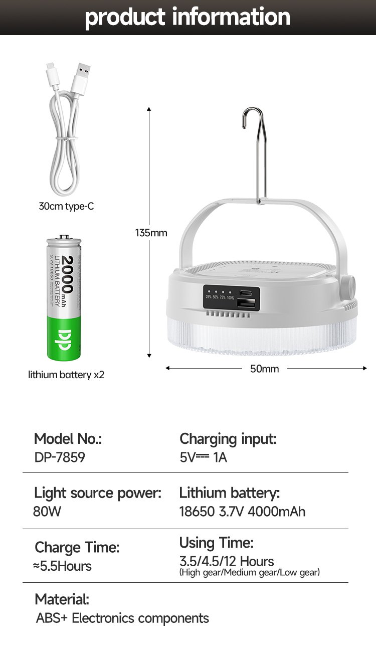 Quick Recharge: The lantern fully charges in about 5.5 hours via the Type-C input (5V 1A).