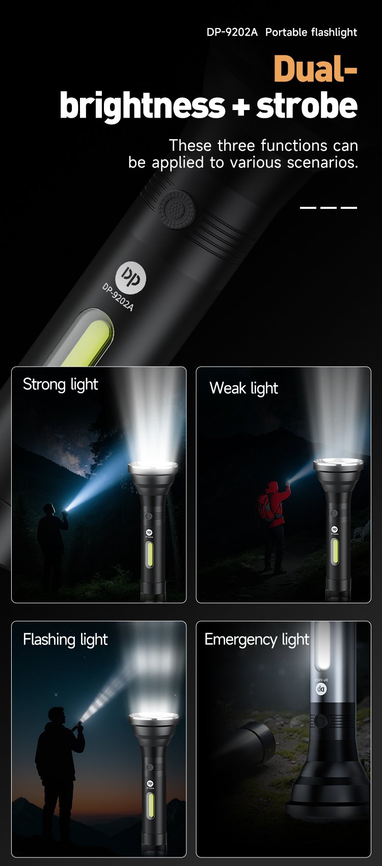 We are DP group, listed company and high-tech enterprise in China, with 4 factories of intelligent manufacturing covering 350,000 square meters. We specialize in LED flashlight, emergency lighting, and other lighting products for over 20 years.